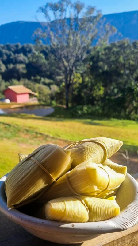 Na casa principal da pousada, você vai se deliciar com sucos naturais fresquinhos, frutas da estação, pães variados, bolos caseiros, biscoitos, frios, granola, iogurte, leite e, claro, o irresistível pamonha e o pão de queijo mineiro, sempre quentinho. Para acompanhar, um saboroso café da região que aquece o corpo e a alma.